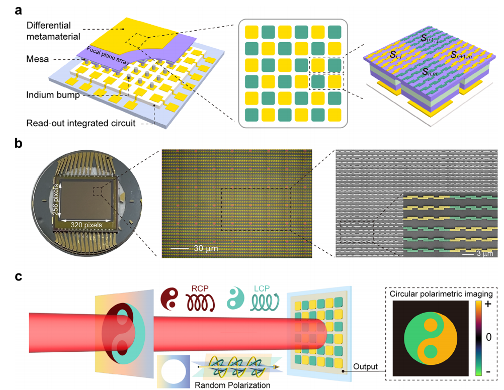 紅外多自由度偏振分析儀圓偏振計芯片實物照片(256×320像素);c:圓偏振成像原理示意圖。