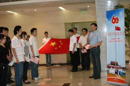 大家早上好,今天我們以升旗宣誓的方式歡慶祖國六十華誕,表達了大家對祖國的美好祝愿,展示了技物所年輕人朝氣蓬勃的精神風貌和。