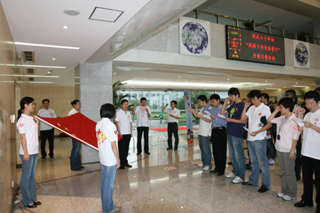 伴隨著催人奮進的進行曲,護旗手李雪從黨委書記郭英手中接過鮮艷的五星紅旗,由所2006-2008年度所優(yōu)秀青年標兵廖清君、王成良、李淑微、李雪、王躍明及團干代表劉丁臻組成的國旗護衛(wèi)隊護送國旗出場。全場肅立,向國旗行注目禮,嘹亮義勇軍進行曲回蕩在大樓中庭。其后,在所團委副書記劉丁臻的帶領下,全體青年在國旗下進行宣誓,表達為祖國繁榮富強奮斗的決心。宣誓完畢后,王躍明代表我所青年發(fā)言,他深深地感受到了祖國科技事業(yè)日新月異,感受到了年輕人肩負的重大歷史使命,他號召青年朋友們立足本職、踐行誓言,不斷錘煉自我、發(fā)展自我,攜手創(chuàng)造技物所更加輝煌燦爛的明天。最后,所長何力在國旗下做了熱情洋溢的講話,他鼓勵年輕人珍惜年華、把握時機,在最具創(chuàng)造活力的青春歲月中積極進取、揮灑智慧,主動把個人成長與研究所發(fā)展結合起來,在技物所這個平臺上投身祖國科技事業(yè)、航天事業(yè),為推進研究所各項工作中貢獻力量,書寫精彩的青年樂章。