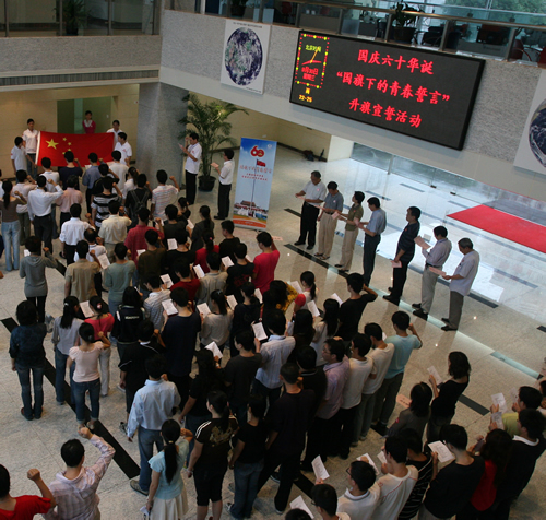 領誓:激蕩六十載,輝煌耀九州。青年朋友們,讓我們面向國旗,舉起右手,