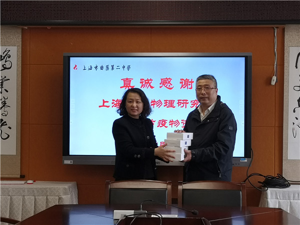 上海市曲陽(yáng)第二中學(xué)龍藝校長(zhǎng)(左)接受贈(zèng)與