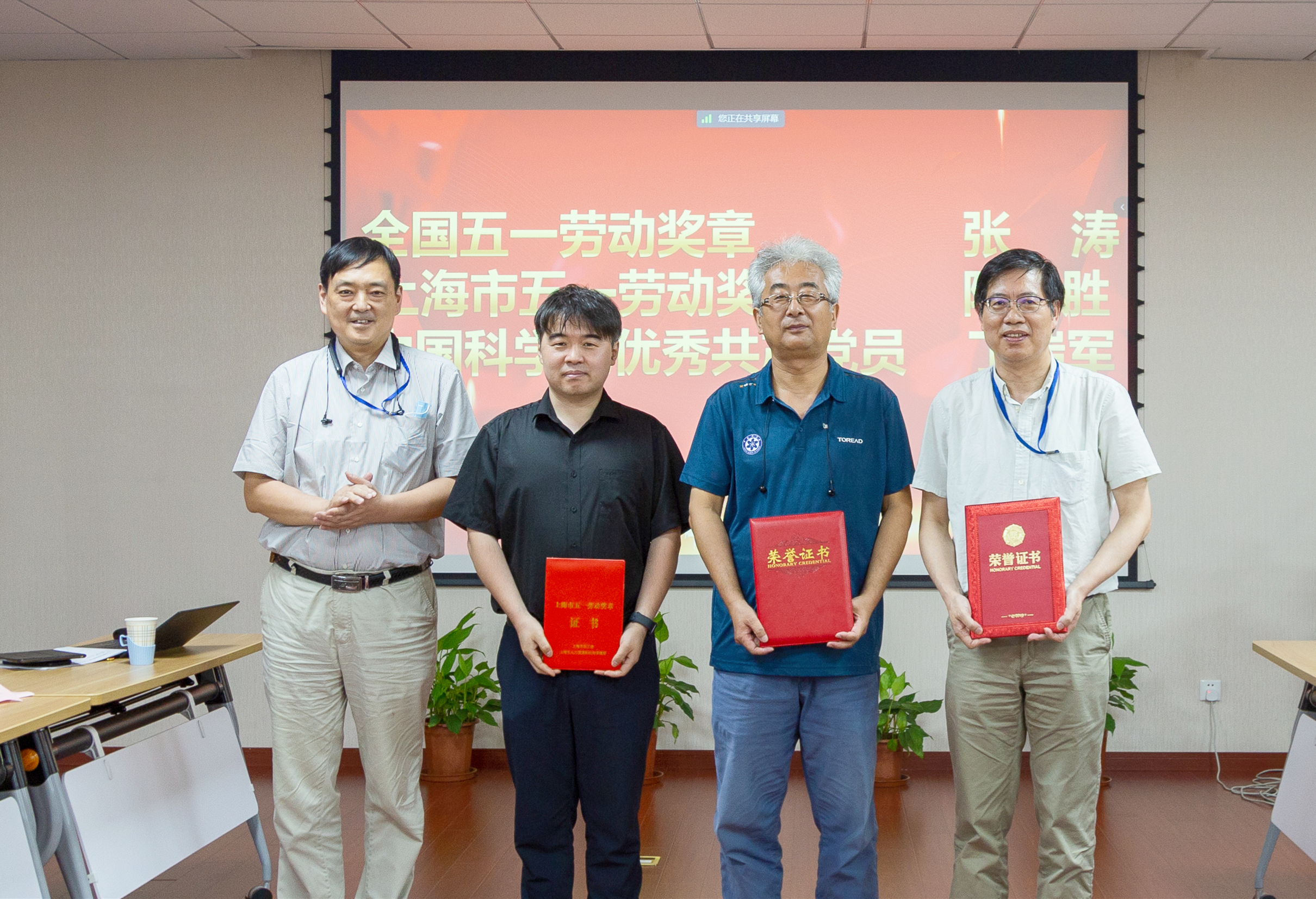 丁雷(左一)為全國五一勞動獎章獲得者張濤(右二)、上海市五一勞動獎章獲得者陳凡勝(左二)、中國科學院優(yōu)秀共產(chǎn)黨員獲得者丁瑞軍(右一)頒獎