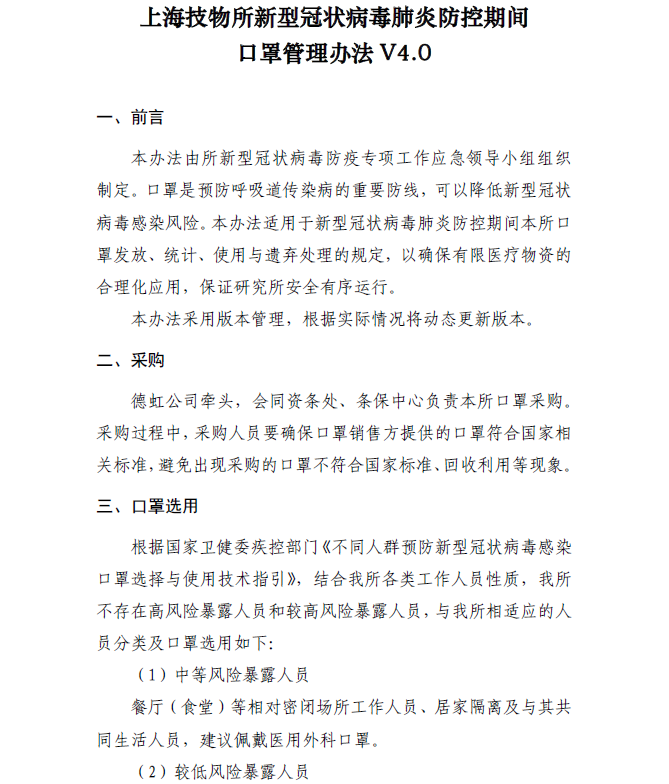 上海技物所新型冠狀病毒肺炎防控期間口罩管理辦法
